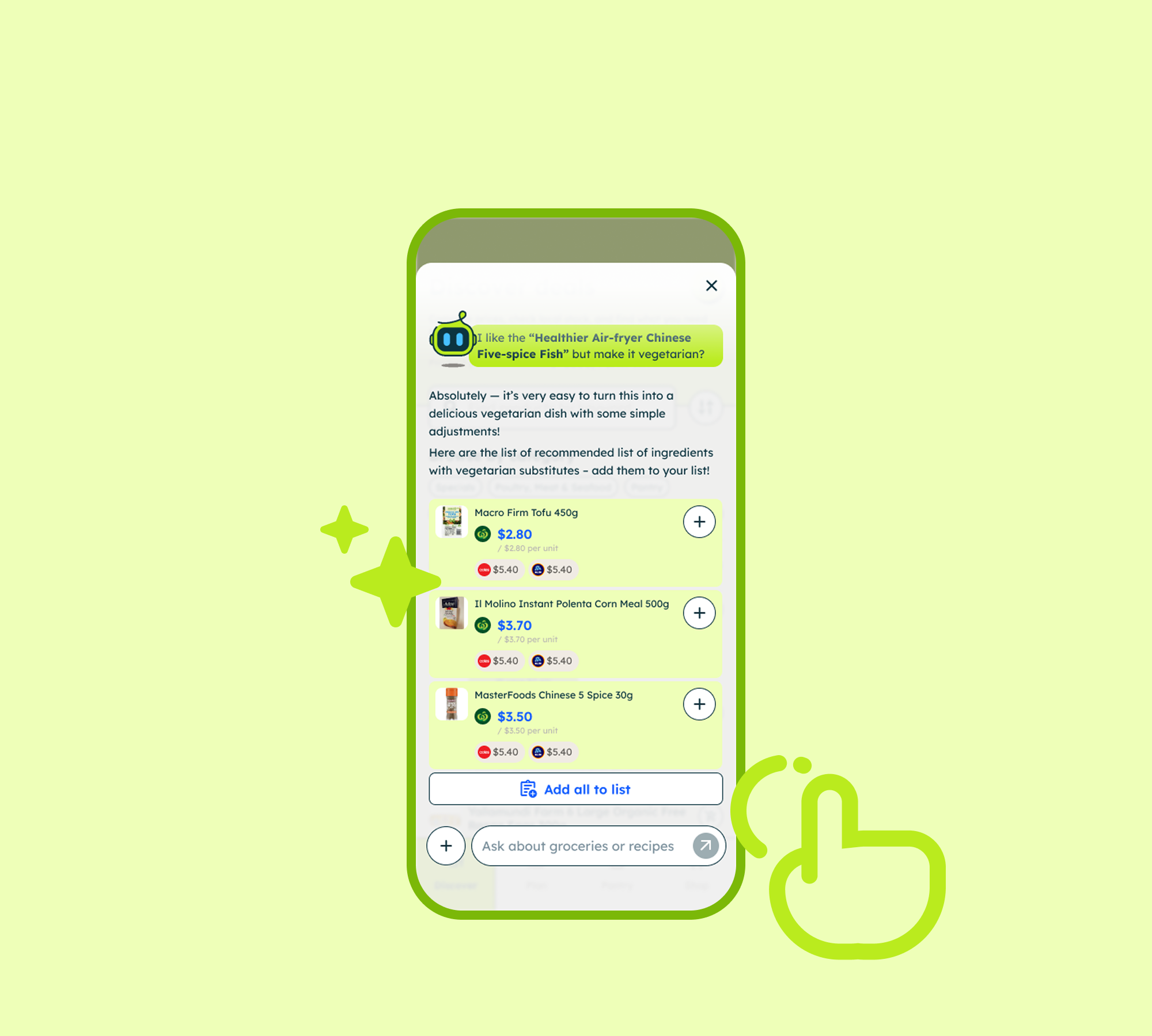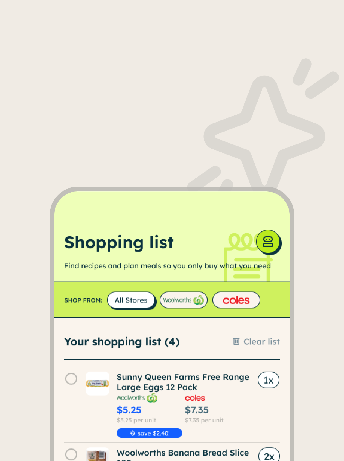 Our AI pulls in actual products, prices, pack sizes, and specials from both supermarkets — so every recipe is made with real items you can actually buy.